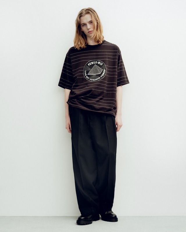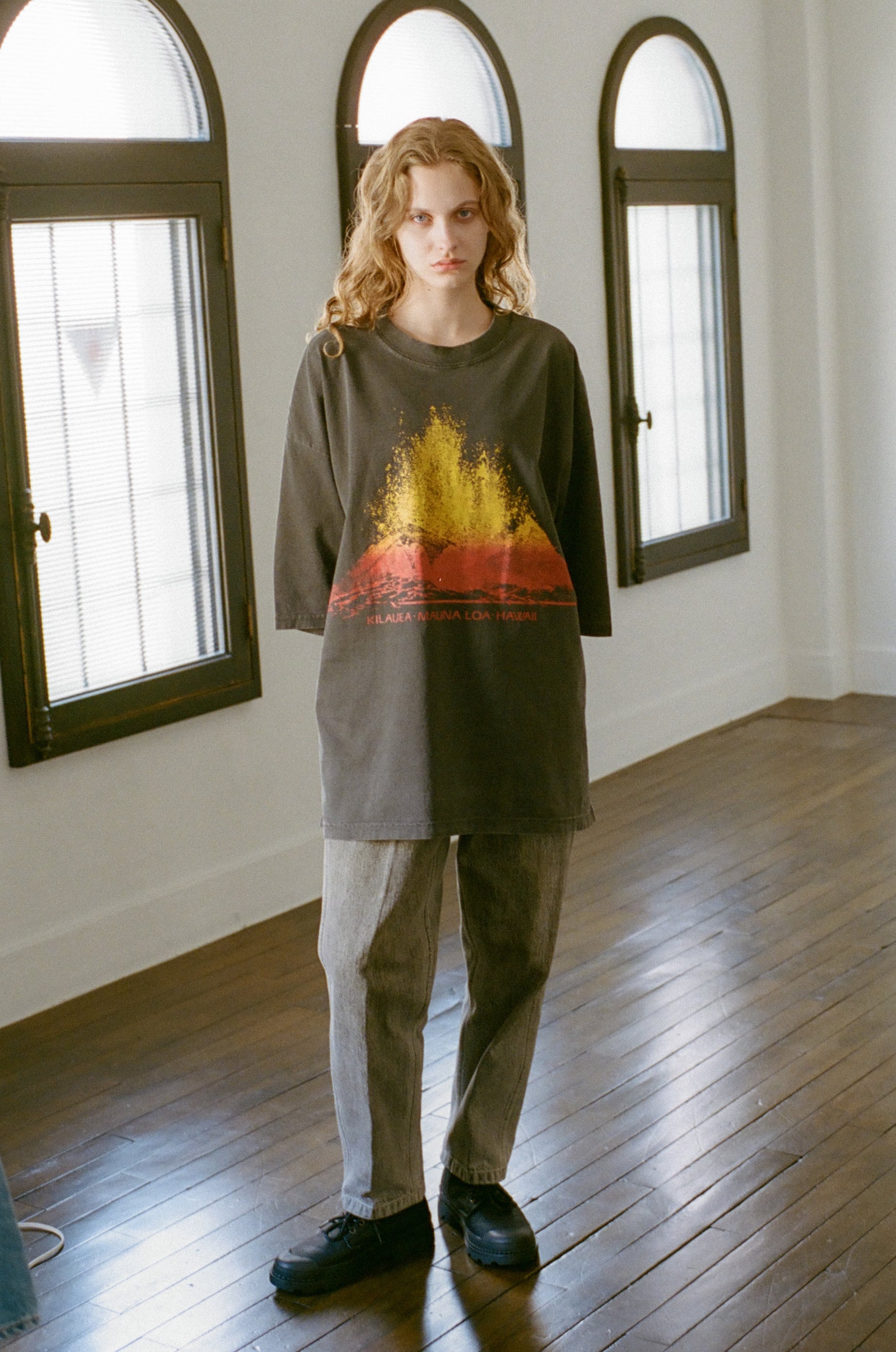 7.5ozヘビーウェイト天竺を使用。ピグメント(顔料)染めにより、洗いを重ねるごとに風合いが増す生地感が特徴。ハワイのスーベニアTシャツを着想に、大判の火山グラフィックを配した一枚。
