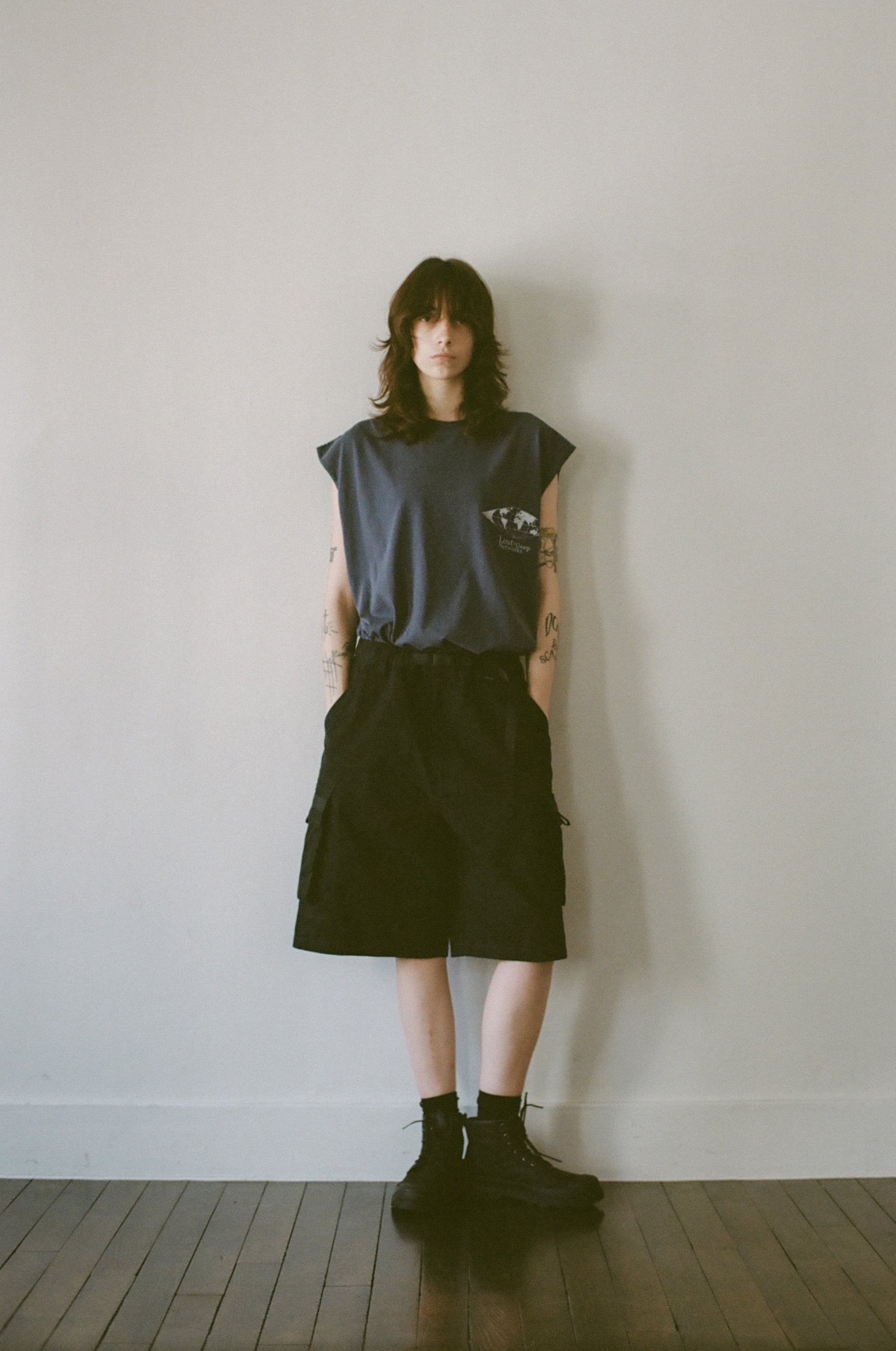 6.0ozリングスパンコットン天竺を使用。製品染めにより、洗いを重ねるごとに風合いが増す生地感が特徴。袖は手作業でカットオフしており、ラフな表情に仕上げています。