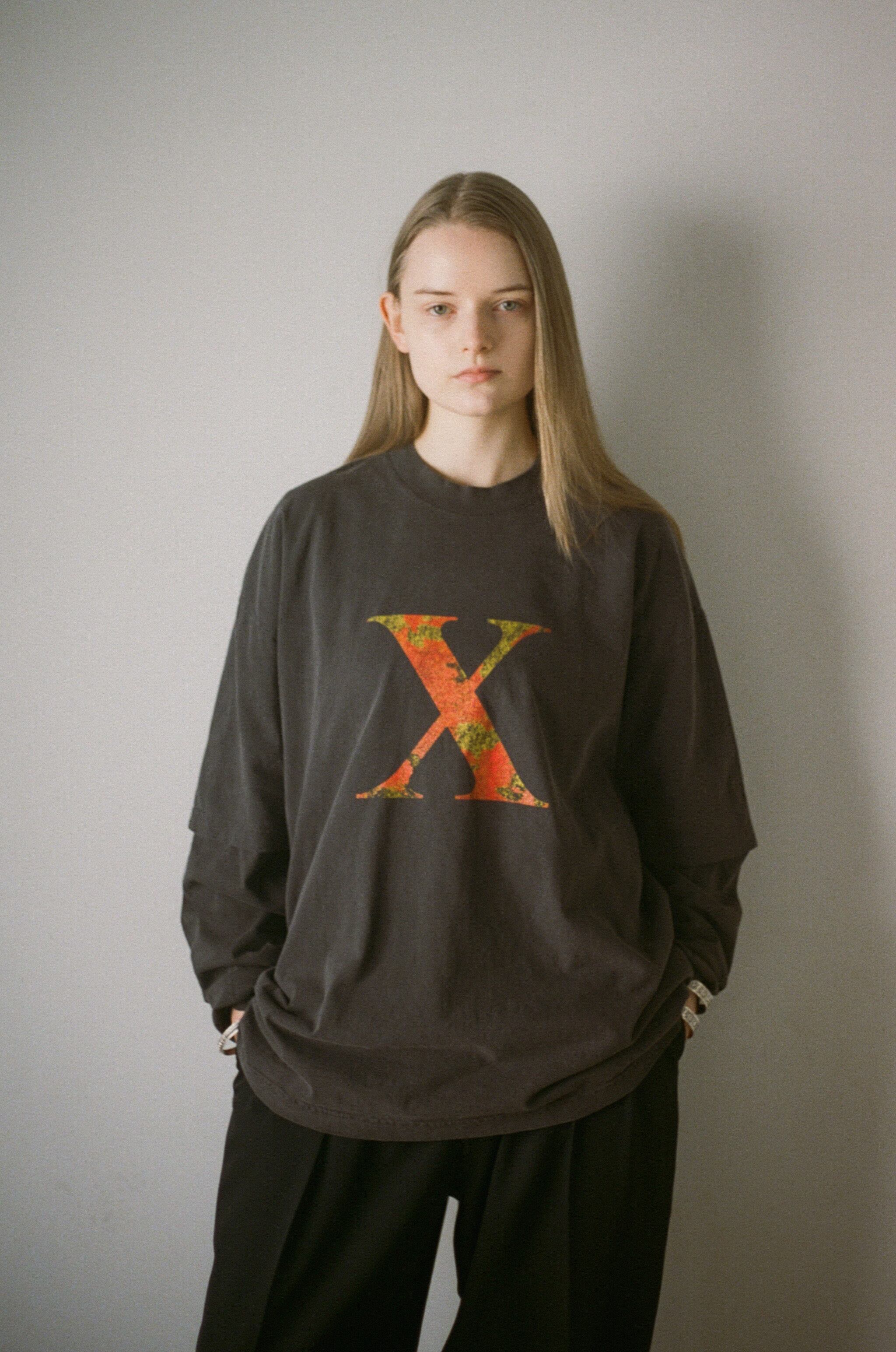本作『X』は、そのシリーズの中で、未知、変数、未定義を象徴する記号として用いられてきたモチーフ。開かれた可能性と解釈の余白を、ミニマルなグラフィックとして表現している。