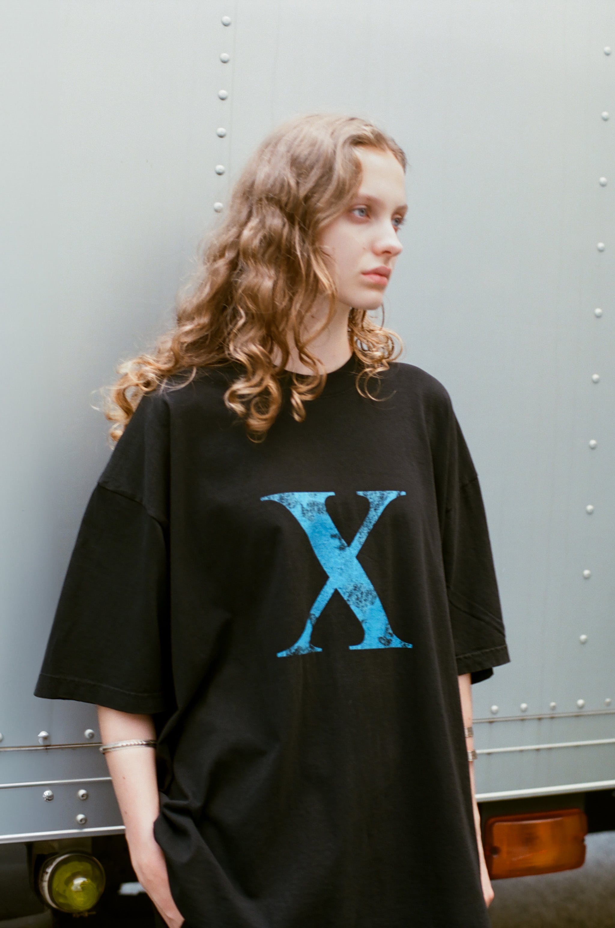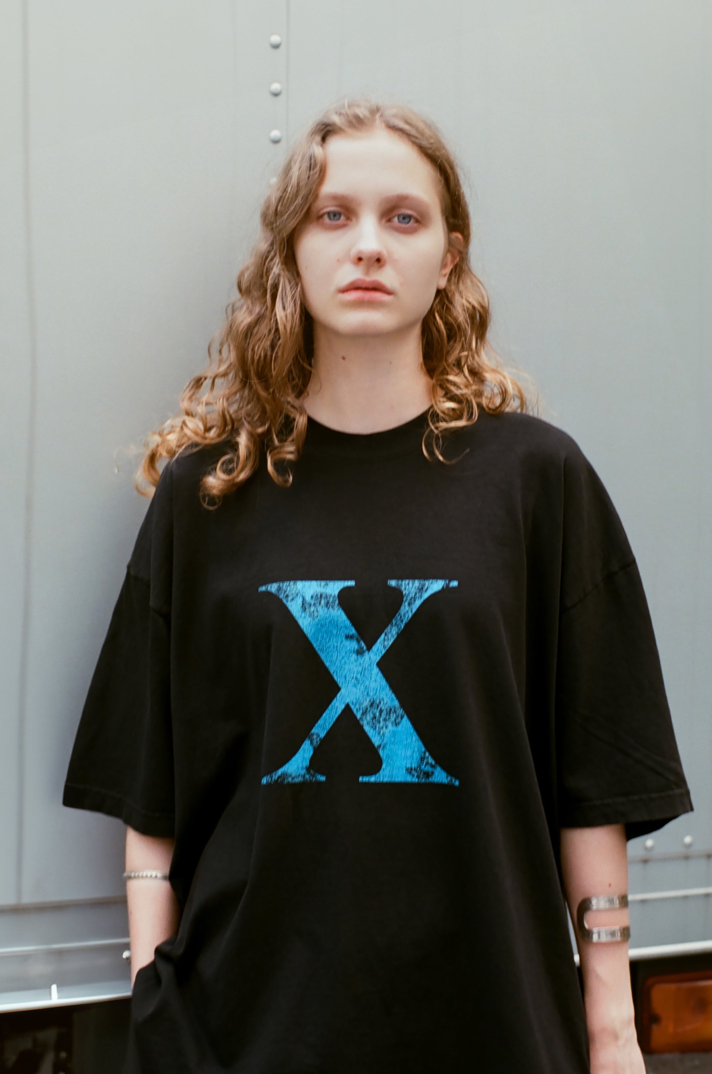 本作『X』は、そのシリーズの中で、未知、変数、未定義を象徴する記号として用いられてきたモチーフ。開かれた可能性と解釈の余白を、ミニマルなグラフィックとして表現している。