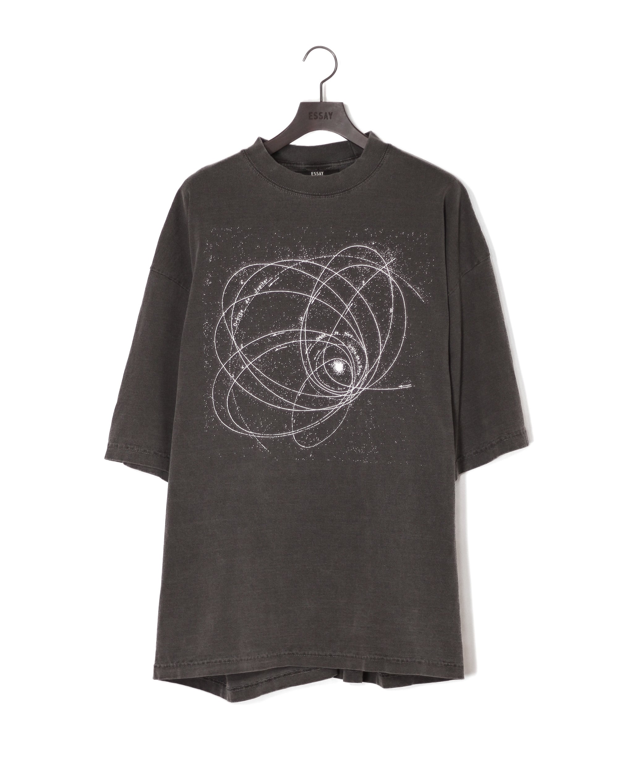本作『UNIVERSE』は、そのシリーズの中で、古い惑星の軌道図を参照し、歴史的な宇宙観測の図像を抽象化したプリントデザイン。距離や秩序、宇宙の構造を視覚的な構成として再解釈している。
